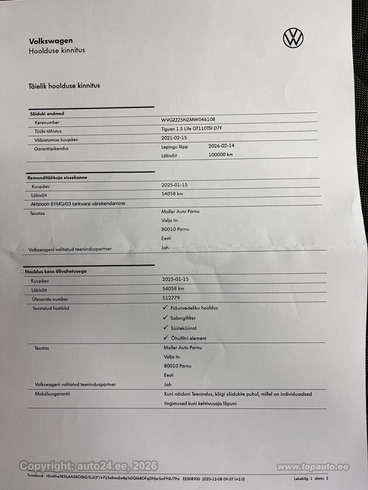 - Viimane hooldus 02.2025 läbisõidul 72 983 kilomeetrit